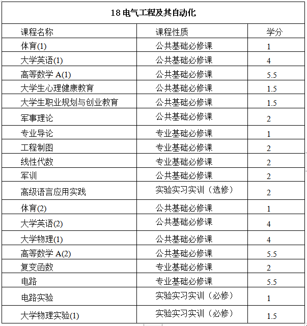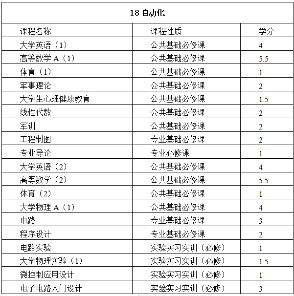表2 自动化MK体育·(国际)官方网站各专业一年级教学计划