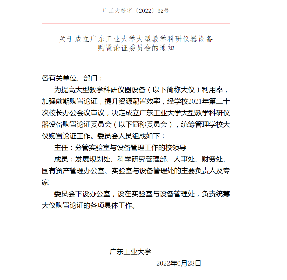 • 关于成立广东工业大学大型教学科研仪器设备购置论证委员会的通知2022-10-17
